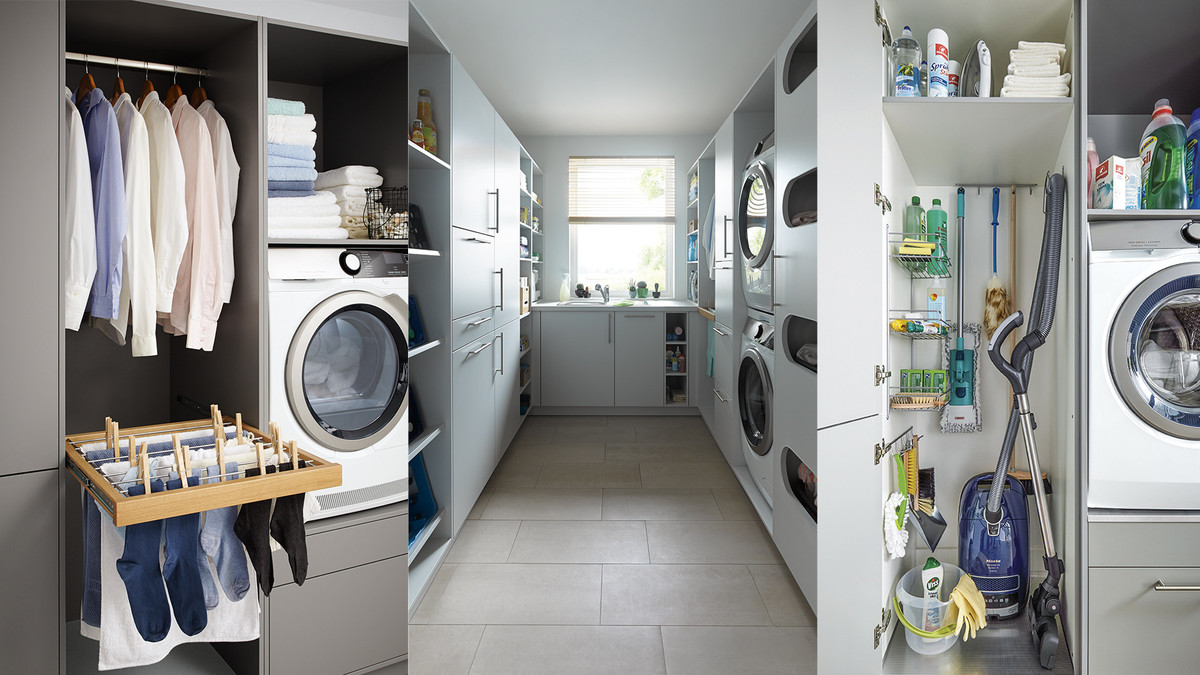 Odlično za pranje in sušenje perila - npr. visoko vgrajeni aparati in izvlečni elementi, ki vam olajšajo delo. Vse je vgrajeno in prostorsko varčno in usklajeno z načrtovanimi delovnimi procesi. Tako nastane pametno načrtovan gospodinjski prostor za večfunkcijska opravila.