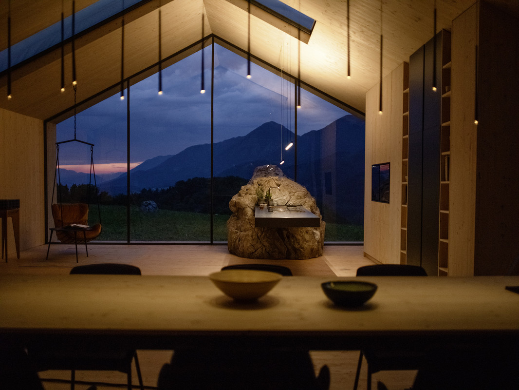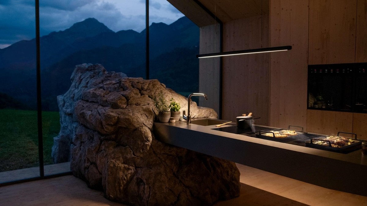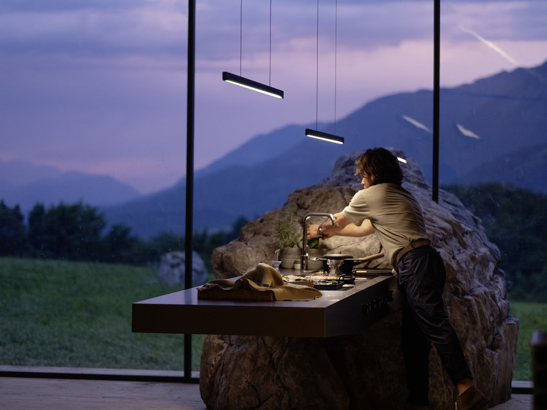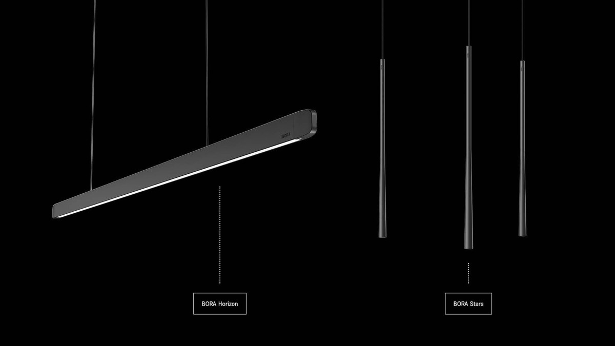 Linearna BORA Horizon svetilka in navpična BORA Stars viseča svetilka bdita nad delovnimi pulti, kuhalno ploščo ali jedilno mizo in zaradi možnosti zatemnitve zagotavljata optimalno osvetlitev in prijetno vzdušje glede na želeno situacijo.