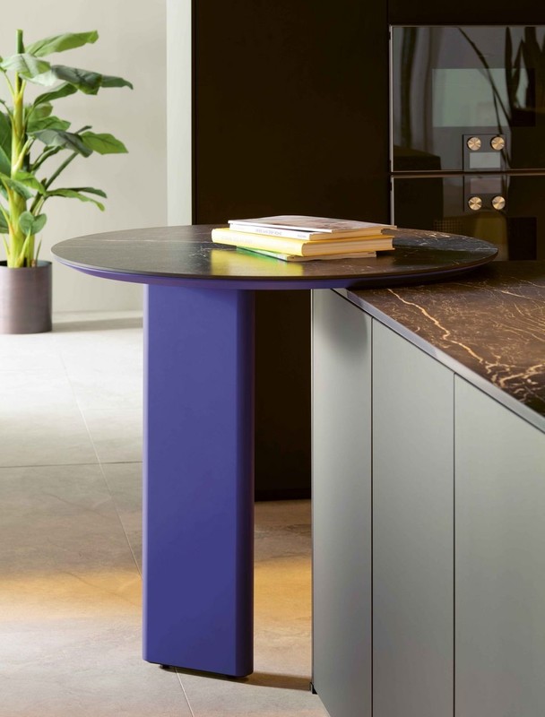 Dve novi barski mizi ponujata doživetje zahvaljujoč delovnemu pultu Systemo. Izbirate lahko med mat žametno lakirano nogo ali prašno lakirano kovinsko nogo iz črnega oniksa s premerom 100 ali 120 cm. Vsestranski dodatek, ki se popolnoma zlijejo s katero koli kuhinjo.