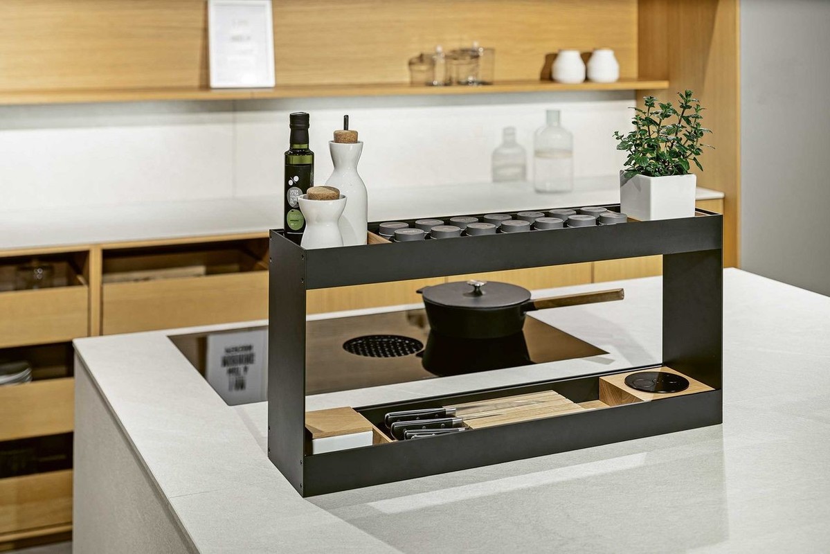 To praktično stojalo za shranjevanje za na pult in otok ponuja vsestranskost in učinkovitost. Regal je mogoče opremiti z različnimi funkcionalnimi vložki v hrastovi barvi, možna pa je tudi integracija vtičnice Twist v črni oniks barvi.