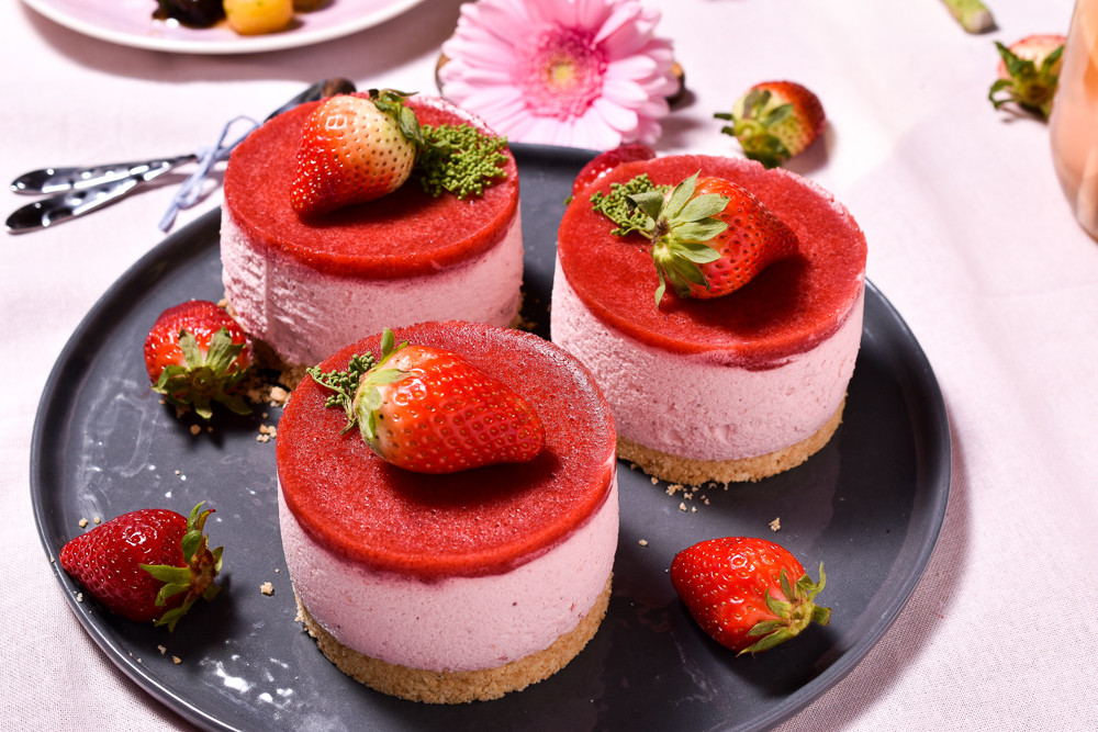 Sladko smetano mešamo do čvrstega in vanjo previdno vmešamo mlačen jagodni pire. Če je premalo sladko, dodatno sladkamo. Iz skrinje vzamemo zamrznjene šebesine diske in jih položimo na sredino podlag, čez njih pa premažemo jagodni mousse. Tortice ohladimo.
